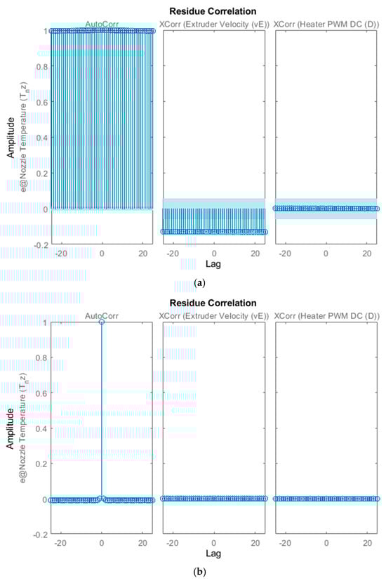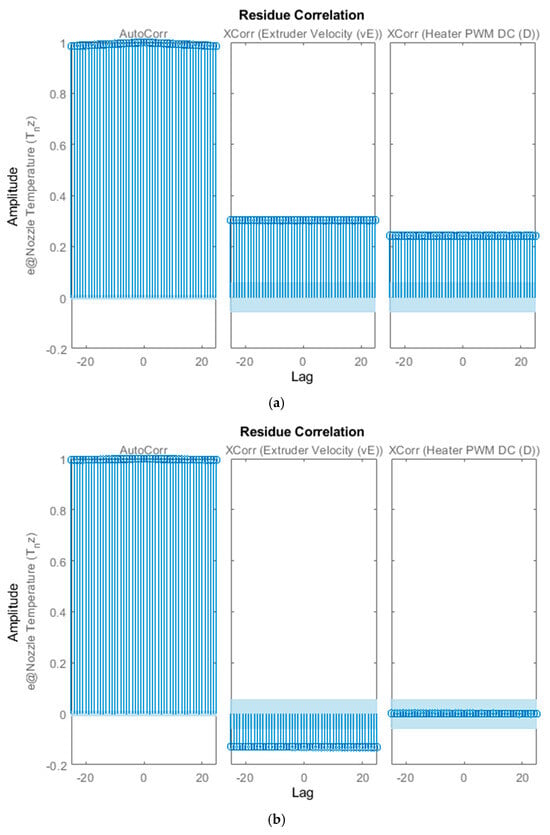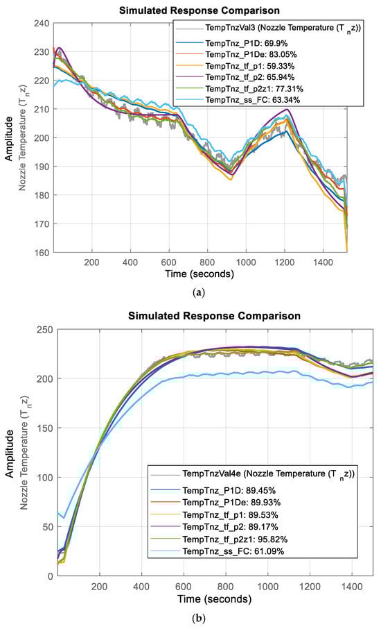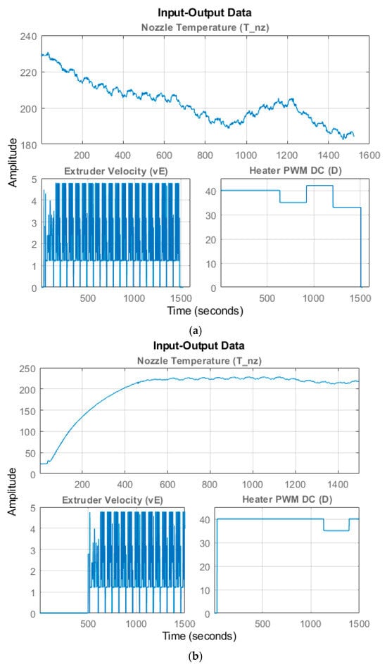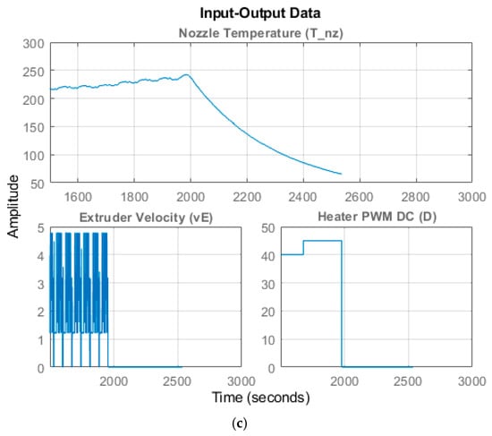 Figure 9 shows the three datasets that were used for validating the estimated empirical models for describing the temperature dynamics. In each dataset, controlled excitations are applied to the heater PWM duty cycle and the filament input velocity , and the corresponding open-loop response of the nozzle thermocouple measurement is recorded. The small oscillations and local peaks in arise from the start–stop nature of short extrusion segments used to excite the system, during which variations in convective heat removal momentarily perturb the melt temperature. In general, increases in reduce because the incoming filament has less residence time to absorb heat before exiting the nozzle, whereas increases in heater PWM duty cycle raise the by supplying additional thermal energy.