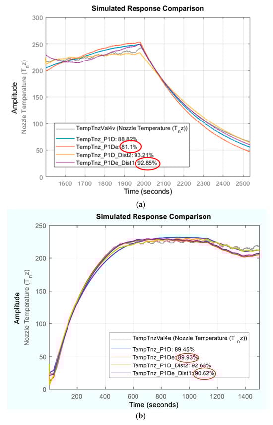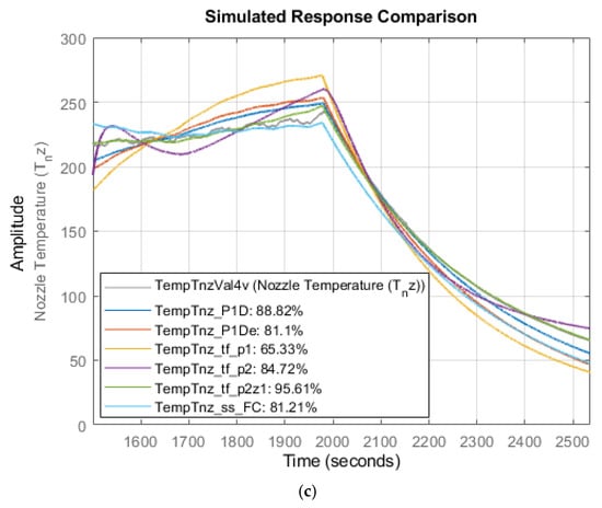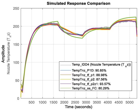 Table 1 summarizes all the different models obtained using the system identification process for describing the temperature dynamics, the fit% to estimation and validation datasets. The fit, in this case, is a normalized root mean square error (NRMSE) [46] that indicates how well the simulated or predicted model response matches the measurement data; this is given by Equation (24):