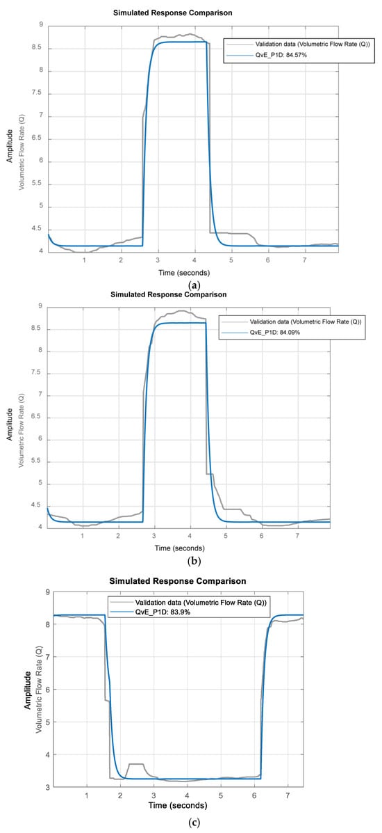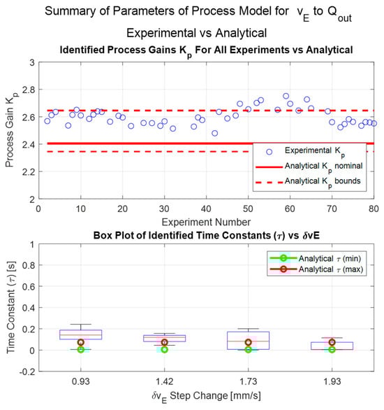 Based on analytical modeling of flow rate dynamics, which resulted in a first order process model-like structure (Equation (15)), a decision was made to use a first order process model with dead time (FOPDT) as the candidate model structure during the model estimation phase of the system identification process. This enabled a comparison of the estimated free parameters of the model and those computed analytically.