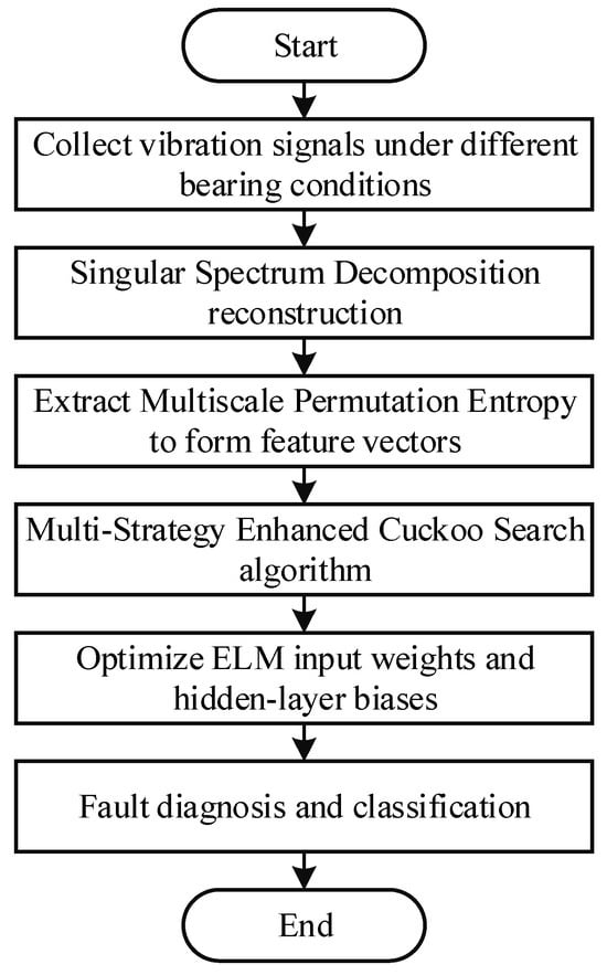 The MS-CS-ELM fault diagnosis model integrates three core components—signal preprocessing, feature extraction, and intelligent optimization learning—to form a comprehensive pipeline from raw vibration data to fault classification. Initially, the acquired vibration signals are decomposed and reconstructed using SSD to suppress noise and amplify fault-related components. Next, MPE features are computed from the reconstructed signals, yielding feature vectors that capture dynamic complexity across multiple temporal scales. These feature vectors are then fed into an ELM, whose input weights and hidden-layer biases are optimized by the MS-CS algorithm to minimize training error. Finally, the optimized ELM model performs online diagnosis and classification of bearing fault types. A schematic of this diagnostic framework is presented in Figure 1.