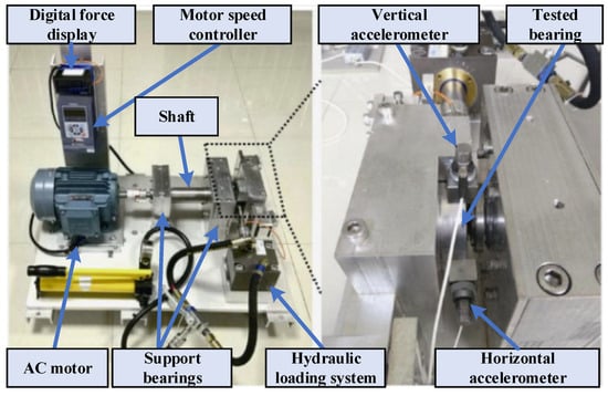 The validation experiments were conducted on the widely used Xi’an Jiaotong University rolling bearing test rig, which comprises a digitally controlled hydraulic loading system, an AC motor coupled to a shaft through a motor speed controller, and support bearings mounting the test bearing under varying load conditions (Figure 2). A digital force display monitors the applied radial load, while vertical and horizontal accelerometers are mounted on the bearing housing to capture vibration responses. The test bearing itself can be configured in one of four distinct states—inner race fault, outer race fault, or cage fault—by introducing controlled defects of known dimensions and locations.