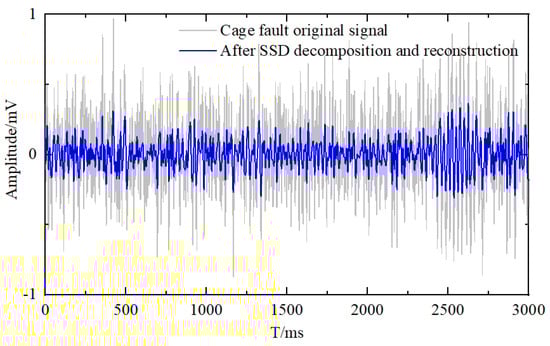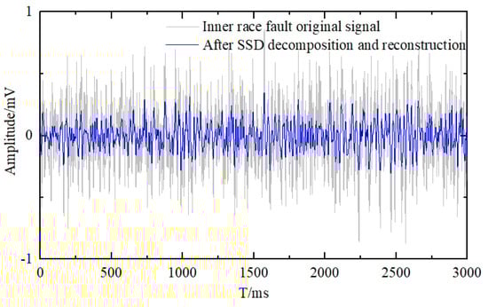 It should be noted that the SSD reconstruction process does not obscure or distort fault-related features; on the contrary, by suppressing random noise and retaining the dominant structural components, it enhances the clarity and separability of characteristic impulses, thereby facilitating more effective and reliable feature extraction in the subsequent MPE analysis. The reconstructed signal shows pronounced enhancement of fault impulses and clear periodicity in the time domain, while its signal-to-noise ratio (SNR) improves by approximately 5–8 dB over the raw signal, thereby boosting the accuracy and robustness of subsequent MPE feature extraction. Similar reconstruction results for inner race and cage faults are presented in Figure 6 and Figure 7.