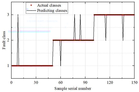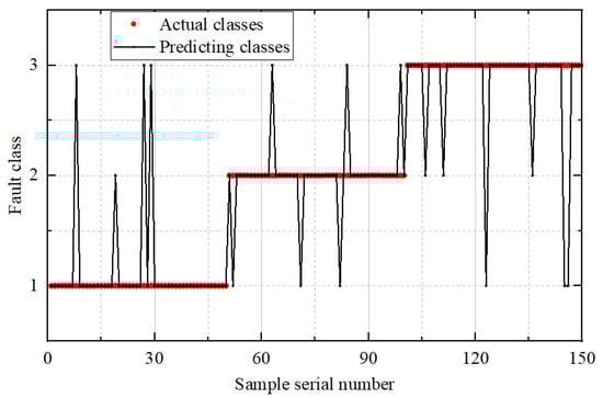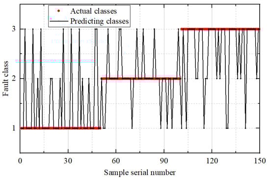 In Figure 8, Figure 9 and Figure 10, the horizontal axis represents the sequence index of test samples, while the vertical axis denotes the fault category, labeled as 1, 2, and 3. The term actual class refers to the true fault label of each test sample, whereas predicting class indicates the category output by the diagnostic model. The noticeable peaks observed in the prediction plots correspond to misclassified samples—instances where the model’s predicted class differs from the actual fault type—thus serving as visual indicators of classification errors. The comparative results indicate that the proposed MS-CS -ELM framework substantially outperforms both the unoptimized ELM and the CS-ELM across all fault categories. Specifically, the baseline ELM yields relatively low classification accuracies of 0.72 for inner race faults and 0.74 for outer race faults, although it performs better on cage faults (0.88). When the conventional Cuckoo Search algorithm is employed to optimize the ELM parameters, the CS-ELM improves recognition rates markedly for inner and outer faults—achieving 0.92 and 0.88, respectively—while maintaining the same accuracy of 0.88 for cage faults. However, the multi-strategy enhancements introduced in MS-CS -ELM drive further gains: the inner race fault accuracy rises to 0.98, outer race recognition to 0.94, and cage fault detection to 0.96. These results demonstrate that the adaptive Levy flight and Cauchy mutation strategies in MS-CS effectively guide the search toward superior weight and bias configurations, thereby enhancing the model’s ability to capture subtle fault signatures and improving robustness against noise. Overall, MS-CS -ELM achieves relative improvements of 36% on inner race faults, 27% on outer race faults, and 9% on cage faults compared to the baseline ELM, confirming the efficacy of the proposed multi-strategy optimization in achieving high-precision bearing fault diagnosis.