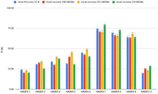 The predicted recoveries obtained from the fitted Box–Behnken model are summarized in Table S5. The model predicted recoveries of 86.9%, 92.5%, 88.7%, and 80.4% for 25I-, 25C-, 25B-NBOMe, and 2C-B, respectively. The low standard errors (2.7–3.5) and narrow confidence intervals confirm the model’s precision and predictive reliability. The experimental recoveries were within the 95% prediction intervals, validating the adequacy of the proposed quadratic model.