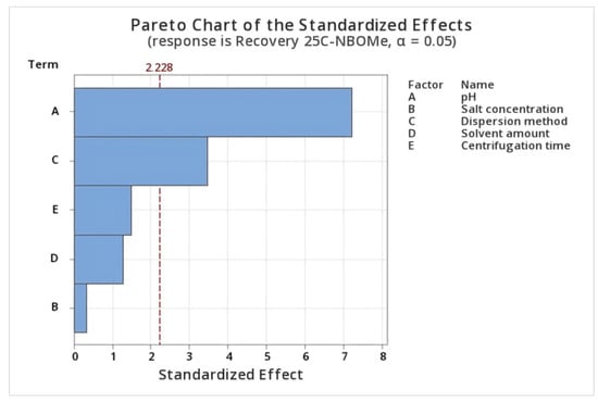 Standardized (p = 0.05) Pareto chart, representing the estimated effects of parameters on the Recovery value of 25C-NBOMe.