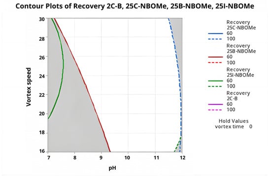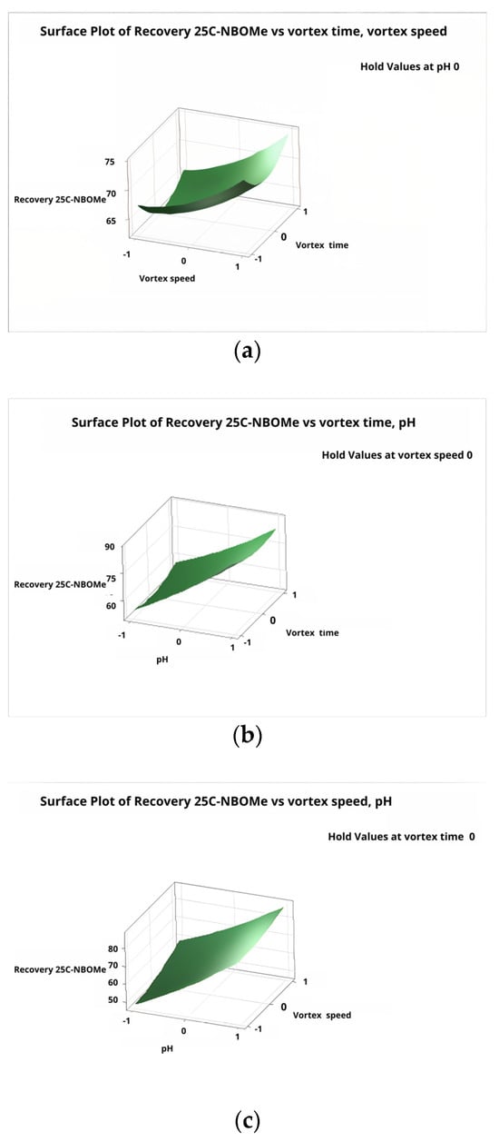 Recovery25C-NBOMe = 65.00 + 15.500 pH + 4.125 VortexSpeed − 0.375 VortexTime+ 2.00 pH2 + 1.75 VortexSpeed2 + 3.75 VortexTime2 − 1.25 (pH · VortexSpeed) − 1.75 (pH VortexTime) + 0.50 (VortexSpeed VortexTime)