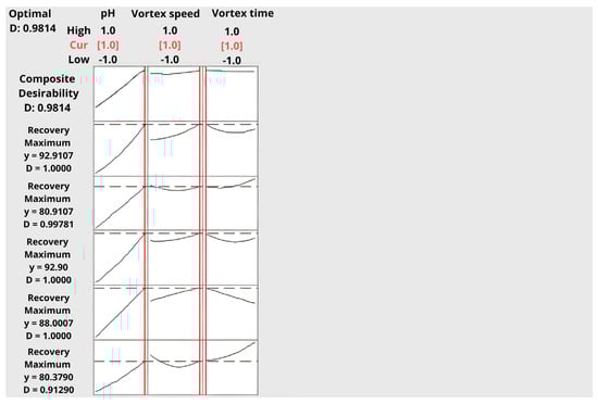 The desirability function was applied to identify the combination of factor levels that simultaneously maximized extraction recovery for all analytes. The optimization revealed that the most desirable conditions were achieved at a sample pH of 12, a vortex time of 20 s, and a vortex speed of 30,000 rpm, yielding a high composite desirability value of 0.9848 (Table 5).