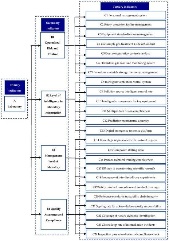As for tertiary indicators, they are further subdivided from the above secondary indicators to reflect specific aspects, with the aim of capturing the nuanced characteristics or performance of the secondary indicators. Specifically, standardized management covers personnel management, safety management, and instrument and equipment management [36]; intelligent construction includes the introduction of intelligent equipment, monitoring and identification alarm system, and information technology platform construction [37]; team and implementation management involves the composition of the team, the implementation of work, and the implementation of safety education and training [38]; responsibility system management covers the traceability of dangers, the implementation of the safety responsibility system, and the implementation of the safety incentive verses punishment mechanism, as well as the auditing of internal and external problems. Three levels of indicators covering 24 aspects of mining laboratories are illustrated in Figure 2 below.