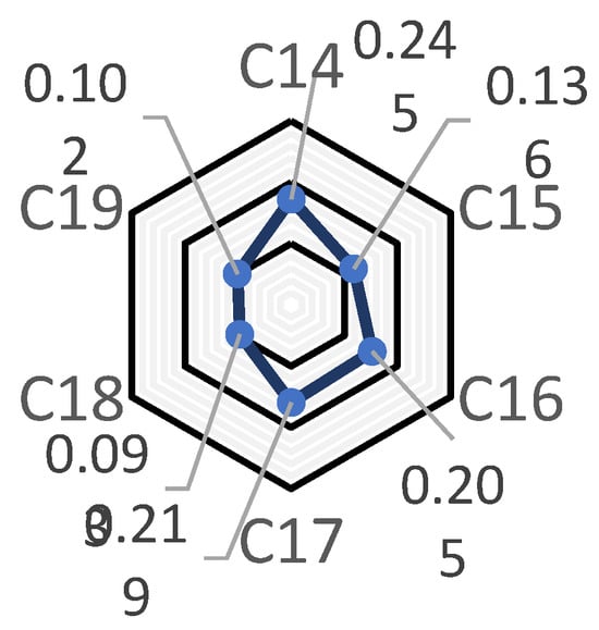 The results as shown in Figure 8 indicated that within the standardization of laboratory management (B1), the weights of dust concentration control standard (0.0436) and equipment standardization management (0.0393) were significant. In laboratory responsibility system management level (B4), the reference standards traceability chain integrity (0.0427) notably influences overall risk. The top five weighted indicators are predominantly concentrated in laboratory team and the level of execution management (B3), affirming the characteristic of human-factor risk dominance in mining laboratories.