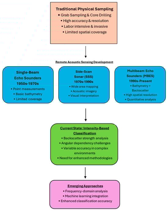 Figure 1 provides a comprehensive overview of the technological evolution in acoustic seabed characterization, summarizing the progression from traditional invasive sampling methods through the development of remote acoustic sensing technologies and illustrating the current state of intensity-based classification methods that form the foundation for identifying existing limitations.