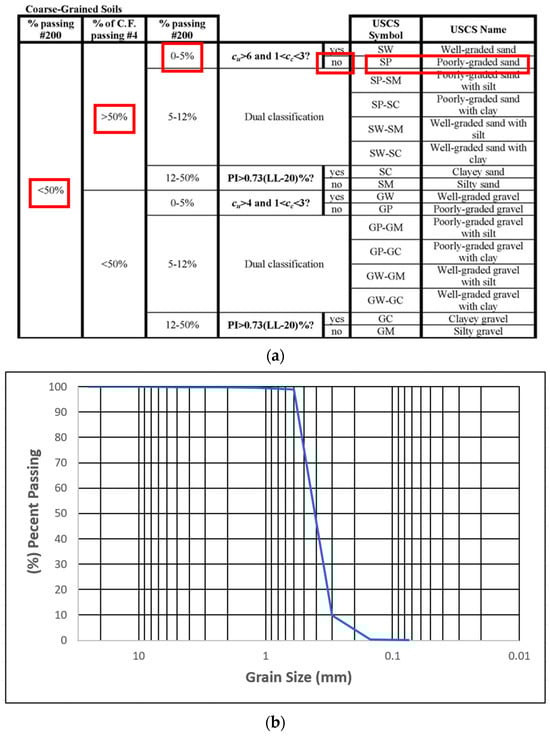 (a) Grain size distribution curve for SP soil and (b) acceptance result table.