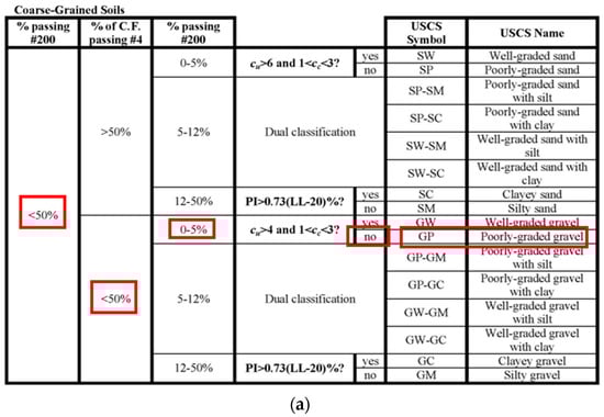 (a) Grain size distribution curve for GP soil and (b) acceptance result table.