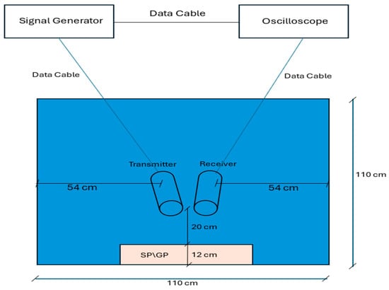 The attenuation model calibration required precise acoustic measurements using specialized ultrasonic equipment. Figure 3 shows the complete experimental apparatus used for data acquisition, including the water tank setup, ultrasonic transducers, signal generator, and digital oscilloscope. The signal generator produces controlled, monochromatic acoustic pulses across the 100–400 kHz frequency range. At the same time, the digital oscilloscope records the received waveforms with the high temporal resolution required for accurate energy calculations.