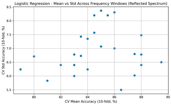 Given the limitations of traditional acoustic classification, recent advances in artificial intelligence offer transformative potential for overcoming these challenges, with the integration of AI into acoustic analysis presenting a promising pathway forward. Machine learning algorithms, including support vector machines and deep neural networks, have shown the potential to enhance classification accuracy by identifying complex, nonlinear patterns in multidimensional acoustic datasets [25,32,34,35,37,38]. This study compares ensemble methods (Random Forest) explicitly with traditional statistical approaches (Logistic Regression) to evaluate their relative effectiveness in spectral-based sediment classification. Studies using convolutional neural networks and hybrid architecture have reported classification accuracies exceeding 90% in some cases, particularly when applied to multibeam echo sounder data combined with angular and textural features [25,37,38]. Despite these successes, most approaches still rely heavily on backscatter intensity or require extensive site-specific training data, limiting their broader applicability [16,27,35].