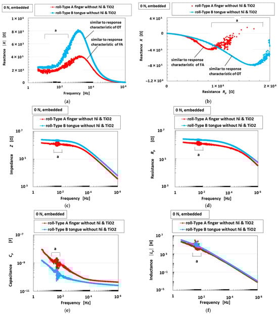 EIS results for roll-type Meissner corpuscles comparing Types A and B sensors without any compression: (a) absolute reactance; (b) relationship between reactance and resistance; (c) impedance; (d) resistance; (e) capacitance; (f) absolute inductance; (a,b) the redundant data are reduced for easier comprehension.