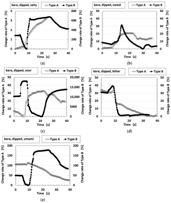 The rate of voltage change in the bare sensor, not embedded in the finger, dipped in each solution. Type A and Type B are compared with regard to the five tastes: (a) saltness; (b) sweetness; (c) sourness; (d) bitterness; and (e) umami.