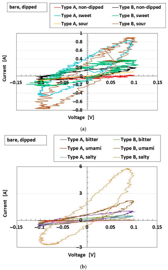 C-V profiles of the bare sensor, not embedded in the finger, dipped in liquid. Type A and Type B are compared with regard to the five tastes: (a) non-dipped, sweetness, and sourness; (b) bitterness, umami, and saltiness.