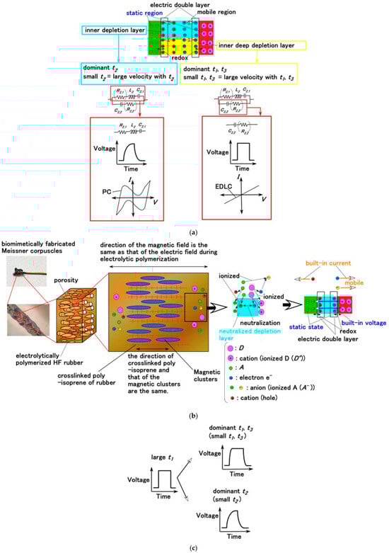 The molecules of HF rubber and water, along with Fe3O4 and Fe particles functioning as dopant D and acceptor A, respectively (Figure 7b), are ionized as D+ (cationic) and A− (anionic). A− tends to be desorbed by holes, whereas D+ remains relatively immobile, thereby generating an intrinsic built-in voltage. The holes, electrons, and A− species that migrate in association with the electronic charge flow are mobile, thereby forming a built-in current. As a result, the HF rubber exhibits piezoresistive behavior. The holes approach negatively aggregated regions formed by A− (desorbed by holes) or, conversely, A− species (absorbed by electrons) migrate toward positively aggregated regions of D+, thereby forming EDL, as illustrated in Figure 7a. A Faradaic reaction occurs at the EDL, and the resulting C-V or I–V profiles exhibit a linear relationship, corresponding to the behavior of an electrical double-layer capacitor (EDLC). When a redox process arises between the static and interfacial D+ and A− species within the EDL, the C-V or I–V profiles become nonlinear, indicating the formation of a pseudocapacitor (PC): the redox regions are between D+ and electrons, and between A− and holes at the circumference of the depletion layer, as shown in Figure 7. The response time t depends on the dynamics of D+, A−, and electrons and can be divided into three components, as expressed in Equation (4): t1, associated with capacitance C and resistance R (approximately equal to 2.2 CR); t2, corresponding to carrier diffusion in deeper regions of the depletion layer; and t3, related to carrier motion within the inner depletion layer [26]. Here, the voltage curve is changed by t1, t2, and t3, as shown in Figure 7c. C arises from the EDLC within the depletion layer, and R is determined by the mobility of D+ and A− across the layer. Thus, the interrelation among the C-V or I–V profiles, EEC, and sensor-voltage variations remain inadequately clarified in current gustation studies (ex. [27]).