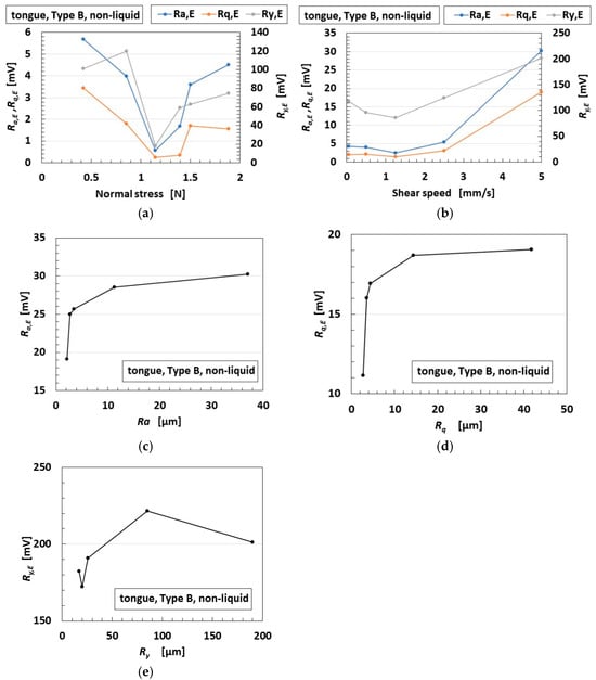 Ra,E, Rq,E, and Ry,E of sensor voltage in the tongue under shearing without liquid: (a) the effect of normal stress; (b) the effect of shear velocity; (c) the effect of surface roughness Ra; (d) the effect of surface roughness Rq; (e) the effect of surface roughness Ry.