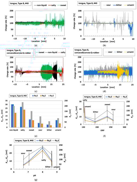Correlation of the sensor voltage with shearing and tasting with the tongue: (a) change rates of the sensor voltage without liquid and in liquids with saltiness and sweetness in response to shearing on #40 sandpaper; (b) change rates of the sensor voltage without liquid and in liquids with sourness, bitterness, and umami in response to shearing on #40 sandpaper; (c) change rates of the sensor voltage without liquid and in liquids with saltiness and sweetness in response to shearing on concave and convex objects; (d) change rates of the sensor voltage without liquid and in liquids with sourness, bitterness, and umami in response to shearing on concave and convex objects; (e) Ra,E, Rq,E, and Ry,E of the sensor voltage for five tastes in response to shearing on #40 sandpaper; (f) Ra,E, Rq,E, and Ry,E of the sensor voltage versus ORP in response to shearing on #40 sandpaper; (g) Ra,E, Rq,E, and Ry,E of the sensor voltage versus pH in response to shearing on #40 sandpaper.