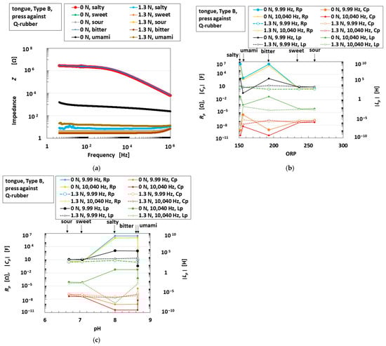 Correlation of the sensor voltage in response to pressing and tasting with the tongue: (a) the impedance of the sensor voltage over time without liquid and in salty liquids when pressed against soft Q-rubber; (b) the effects of ORP on Rp, Cp, and Lp without liquid and in liquids embodying the five tastes when pressed against soft Q-rubber; (c) the effects of pH on Rp, Cp, and Lp without liquid and in liquids embodying the five tastes when pressed against soft Q-rubber.