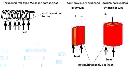 A schematic diagram showing the difference in thermo-sensitivity between our proposed roll-type Meissner corpuscles and our previously proposed mechanoreceptors.