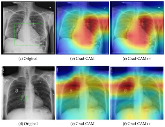 Comparison of Grad-CAM and Grad-CAM++ saliency maps on chest X-rays for cardiomegaly (top row: panels (a–c)) and atelectasis (bottom row: panels (d–f)). The green frame in (a,d) indicates the areas of interest. Red regions indicate areas of high feature importance, while blue regions represent areas of low relevance. Grad-CAM++ provides finer localization and improved boundary delineation compared to standard Grad-CAM, enhancing interpretability.
