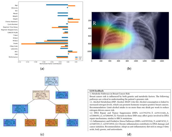 Rule-based explanations (Figure 5c) are valuable in genomics and pathology, where decision paths can be expressed as interpretable conditions, supporting compliance and formal reasoning in clinical workflows. Text-based summaries (Figure 5d) complement visual outputs by explaining high-risk predictions in natural language, as by highlighting breast cancer patients with elevated risk scores, thereby improving accessibility for non-technical stakeholders and building trust in the predictions.
