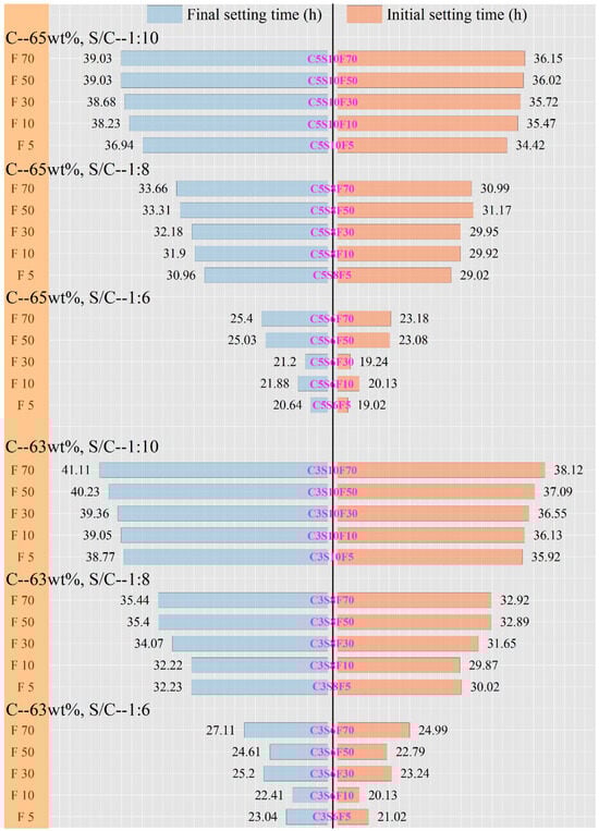 The setting time is a crucial parameter of the early hydration behavior of PCPB specimens and provides important insights into their early strength development. The setting time results of the PCPB specimens are presented in Figure 1. It can be observed that C5S6F5 exhibited the shortest setting time, with initial and final setting times of 19.02 h and 20.64 h, respectively. In contrast, C3S10F70 showed the longest setting time, with initial and final setting times of 38.12 h and 41.11 h, respectively. This pronounced delay can be attributed to the combined effects of the lower cement content and the highest fluoride content, both of which suppress cement hydration [22]. Furthermore, at a sand-to-cement ratio of 1:6, the PCPB specimens exhibited the shortest times to reach both initial and final setting among the three ratios. This may be attributed to the higher ratio diluting the paste and accelerating ion diffusion, thereby accelerating hydration reactions [4]. Under identical sand-to-cement ratios, the setting times of PCPB specimens with different concentrations were relatively similar, consistent with their mechanical strength results. Concurrently, as both the sand-to-cement ratio and concentration decrease, the reduced cement content in the slurry prolonged the setting time of the PCPB specimens. Interestingly, compared to C5S6F5, C5S6F70 exhibited initial and final setting times of 23.18 h and 25.4 h, respectively. This may be attributed to the reduced fluoride content, which mitigates the inhibitory effect of fluoride on cement hydration, thereby accelerating the setting process and enhancing early strength development in PCPB specimens.