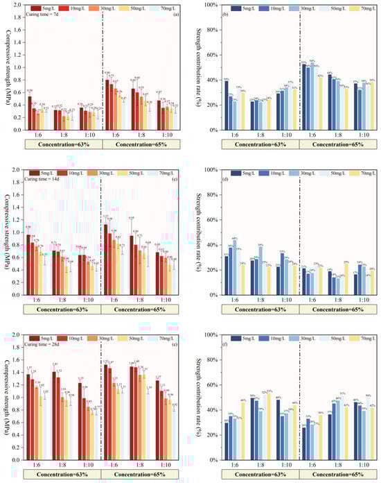 The strength and strength contribution rates of PCPB specimens at different curing times. (a) The strength of specimens cured for 7 d, (b) Strength contribution rates during the 0–7 d, (c) The strength of specimens cured for 14 d, (d) Strength contribution rates of PCPB specimens during the 7–14 d, (e) The strength of specimens cured for 28 d, (f) Strength contribution rates of PCPB specimens during the 14–28 d.