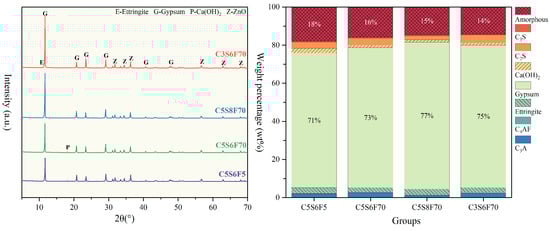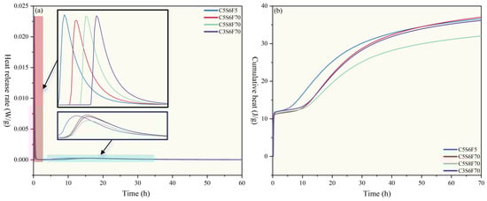 Additionally, it was observed that the C5S6F5 consistently exhibited optimal mechanical properties across all curing times. Interestingly, as the initial fluorine content increased, the C5S6F70 also demonstrated a favorable trend in strength development. Based on these results, C5S6F5 and C5S6F70 were selected for detailed analysis of early hydration behavior, mineral phases, and microstructure of the specimens. Building upon this foundation, the C5S8F70 and C3S6F70 specimens were selected through a controlled variable method to further analyze the influence of cement content on the strength development of the specimens.