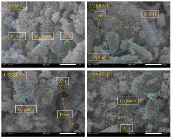 Figure 6 shows the microstructural morphology of the PCPB specimens cured for 28 d. A large number of hydration products, primarily C-S-H gels and AFt, were observed along with residual gypsum and visible pore structures in the PCPB specimens. The C5S6F70 exhibited a relatively loose microstructure with numerous large pores on the surface, indicating incomplete hydration under the high-fluoride environment. In contrast, the C5S6F5 displayed a denser morphology, where interwoven clusters of AFt needles and C-S-H gels formed a compact, continuous microstructure. The heterogeneous distribution of hydration products in C5S6F70, with localized dense and porous regions, likely caused internal volume fluctuations and microcracking, contributing to its lower compressive strength. Compared to the C5S6F70, both C5S8F70 and C3S6F70 showed more dispersed hydration products alongside a higher abundance of large pores. Moreover, larger gypsum crystals are discernible in both C5S8F70 and C3S6F70, indicating that, under identical initial fluoride content conditions, cement content directly influences the early hydration reaction and strength development of the PCPB specimens. While the granular crystals were occasionally observed on the surfaces of the PCPB specimens, likely corresponding to CaF2 crystals embedded within gypsum crystals or denser hydration products [39,40].