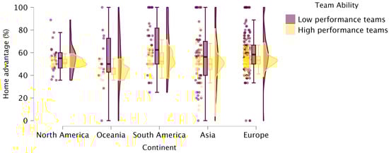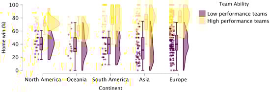 Data were extracted from the open access website www.flashscore.es (Accessed on 13 October 2024). The leagues included in this study were selected based on three conditions: (i) the availability of full, season-by-season match results in open access format; (ii) representation of the main professional women’s leagues in each continent; and (iii) a sufficient number of teams and games to support robust statistical analysis. The variables collected included season, country and continent of each league, wins at home, wins away, total wins, total matches played, and total matches played at home per season. Each observation corresponds to a single team within a single regular season. All seasons were analyzed collectively. Only regular-season games were included in the analysis. Playoff games were excluded to avoid confounding effects related to seeding, competitive imbalance, or shortened travel distances. Data were extracted using customized Microsoft Excel (version 16.0, Microsoft Corporation, Redmond, WA, USA) spreadsheets for further calculation of HA [(total home wins/total wins) × 100] [7,19], home win percentage (HW) [(total home wins/total home games) × 100] [5,13], and team ability [(total wins/total games) × 100] [7]. Teams were categorized according to team ability in each season (e.g., a team that won 40 out of 50 games would have a win percentage of 40/50 = 80%) [5,13]. In this way, a two-step cluster analysis was used to stratify teams according to ability into two different groups (average silhouette = 0.7) as follows: high-performance teams (win percentage = 74.24 ± 12.82%, n = 210 team samples or 41.5% of total dataset) and low-performance teams (win percentage = 32.65 ± 14.21%, n = 296 team samples or 58.5% of total dataset).