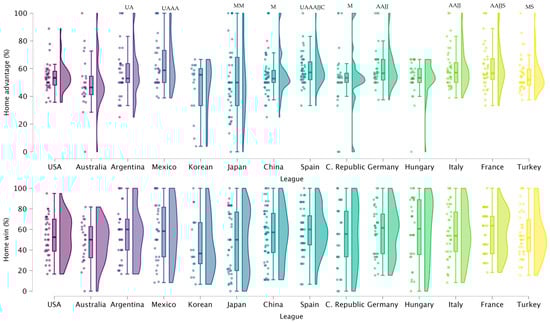 Figure 4 shows the comparisons for HA and HW in leagues. The results of the Kruskal–Wallis test revealed significant differences for HA (p = 0.002; η2 = 0.042), but no significant differences for HW (p = 0.848; η2 = 0.00), between leagues. The USA showed significant a lower HA than Mexico (p = 0.034) and Spain (p = 0.033). Moreover, Australia showed a significantly lower HA than Argentina (p = 0.037), Mexico (p < 0.001), Spain (p < 0.001), Germany (p = 0.002), Italy (p = 0.002), and France (p = 0.002). Mexico presented a significantly higher HA than Japan (p = 0.002), China (p = 0.041), the Czech Republic (p = 0.037), and Korea (p = 0.048). While significantly lower values of HA were found for Japan compared with Spain (p = 0.001), Germany (p = 0.003), Italy (p = 0.005), and France (p = 0.003), in contrast, Spain showed a significantly higher HA than China (p = 0.039), the Czech Republic (p = 0.037), and Korea (p = 0.048).