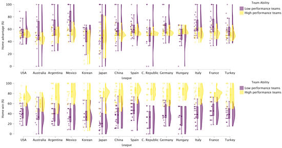The analysis of team ability by leagues revealed mixed results. Low-performance teams from Japan had a significantly lower HA compared to teams from Spain and France. Similarly, high-performance Australian teams exhibited a significantly lower HA compared to teams from Spain, the Czech Republic, and Hungary. These findings align with previous studies conducted in Europe [4,6,13]. In the study examining the five major men’s European Basketball Leagues (Spain, Germany, Italy, Greece, and Israel) over 16 regular seasons, teams were divided by ability into three groups (low ability, medium ability, and high ability) and it was observed that low-ability teams (win percentage = 32.85%) showed a higher HA compared to medium (win percentage = 55.27%) and high-ability teams (win percentage = 80.22%), while high-ability teams demonstrated higher HW than the other ability groups [4]. A similar trend was observed in the two premier Spanish basketball leagues, where during 12 seasons it was observed that lower-ability teams (win percentage = 38.0 ± 10.5%) tended to have a higher HA than higher-ability teams (win percentage = 71.7 ± 11.9%), while higher-ability teams presented a higher HW than lower-ability teams [13]. Additionally, in another study in Spain, it was observed that regardless of the league, lower-ability teams consistently showed a greater HA and lower HW compared with higher-ability teams [6]. Taken together, these findings align closely with the patterns observed in our study, indicating that across elite women’s basketball, teams with low-performance ability rely more heavily on home-court conditions to enhance performance, whereas high-performance teams tend to maintain greater HW.