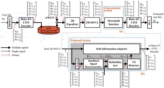 Block diagram of (a) the conventional BPMR system and (b) the additional TS detector that operates together with the soft-information adjuster.