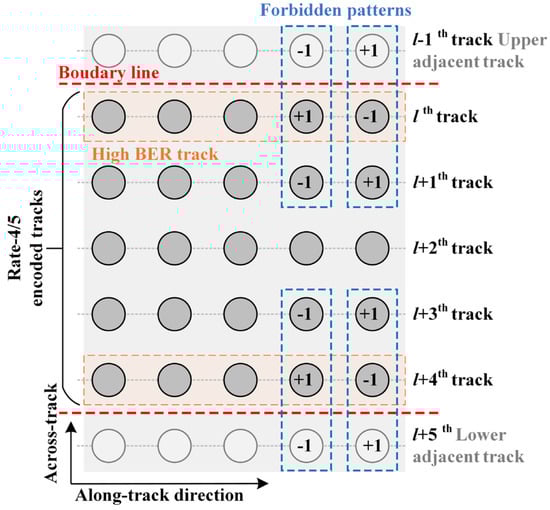 The modulation code, as proposed in [18], is primarily designed to reduce ITI between adjacent encoded tracks, e.g., the lth to l+4th tracks, as shown in Figure 1, by eliminating the destructive data pattern in the across-track direction, e.g., [−1, +1, −1] and [+1, −1, +1]; however, interference from upper and lower adjacent tracks, e.g., l−1th and l+5th tracks, still remains. Note that the writing process in this research is assumed to be perfect writing, implying that the magnetization state of each bit-island always corresponds exactly to the bit being written.