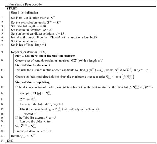 Step 3—Tabu Displacement: From the candidate solutions, the next solution matrix,, is selected as the one with the lowest distance metric, excluding those present in the Tabu list (unless aspiration criteria are met). The metric for each candidate, j, is calculated as: