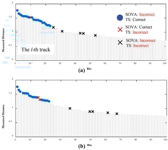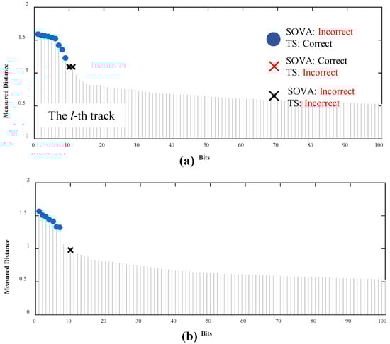 A similar trend was observed at an SNR of 8 dB, as illustrated in Figure 8. The conventional 2D-SOVA detector provided incorrect bits; however, using the TS detector together with our proposed soft-information adjuster can correct nearly all unreliable bits that the 2D-SOVA detector cannot handle for the lth and l+4th tracks, as shown in Figure 8a and Figure 8b, respectively. The results also indicate that the number of input bits should be fewer than 20. Both the 2D-SOVA detector and the TS detector struggle to operate correctly when the measured distance is below approximately 1.2, as indicated by the black cross symbol.