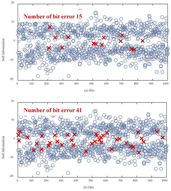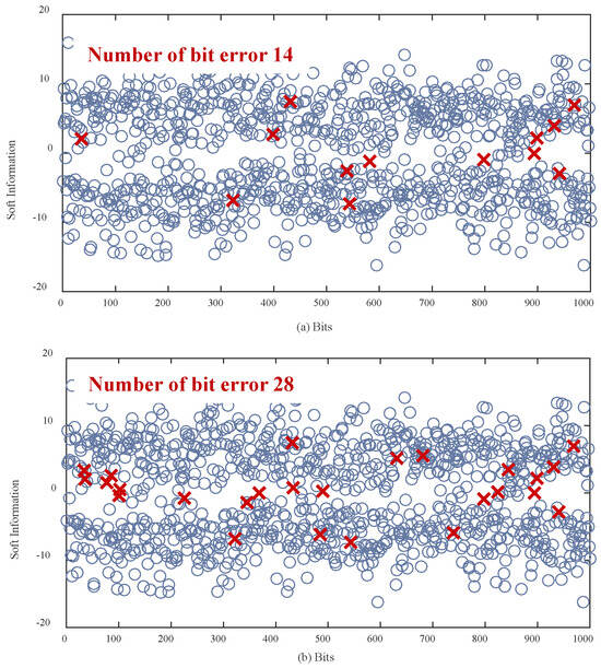 We assessed the system’s ability to correct erroneous bits, as demonstrated by the distributions of soft information. As shown in Figure 9, our proposed technique results in fewer erroneous bits compared to conventional recording methods. Specifically, when media noise is disregarded, our system produces only 14 erroneous bits, whereas the conventional system generates 28 erroneous bits, as depicted in Figure 9a,b, respectively.