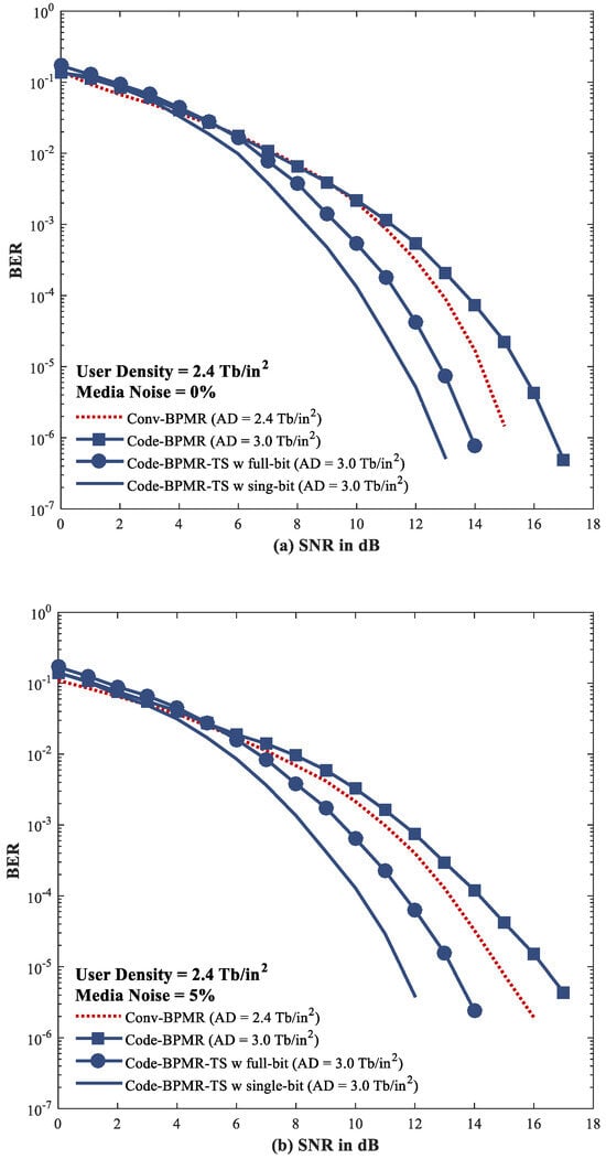 As mentioned earlier, media noise, along with fluctuations in position and size, significantly impacts the efficiency of BPMR systems. Therefore, we have assessed the recording systems under the influence of 5% media noise. As illustrated in Figure 11b, the simulation results clearly demonstrate that our proposed system delivers the best BER performance compared to both conventional coded and uncoded recording systems at the same UD of 2.4 Tb/in2. The proposed TS detector, utilizing one-bit and full-bit criteria for selecting unreliable bits, can achieve SNRs of approximately 1.7 dB and 3.2 dB over the conventional uncoded recording system, respectively. Moreover, our proposed systems, designed to address the edge effects of the 4/5 CITI modulation code, also exhibit better BER performance than conventional coded systems. Specifically, they can achieve SNRs of more than 3.3 dB and 4.8 dB using the single-bit and full-bit criteria for selecting unreliable bits, respectively.