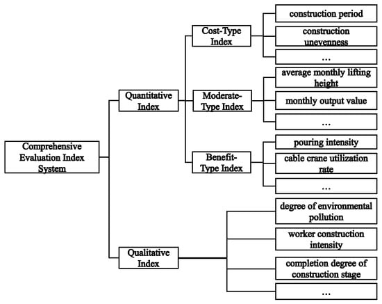Taking the cable crane utilization rate as an example, unlike in simple small-scale engineering projects, a higher cable crane utilization rate in large-scale projects reflects a higher degree of mechanical utilization, indicating high current construction intensity and helping to shorten the construction period to a certain extent. In large-scale water conservancy and hydropower projects, cable cranes are responsible for multiple tasks. They not only need to hoist and transport concrete, but also convey construction machinery and materials, and perform tasks such as defect elimination. Additionally, they require necessary maintenance time. In the construction design scheme, an excessively high utilization rate of cable cranes for concrete pouring means a lack of time margin to deal with other businesses, resulting in a decrease in the feasibility of the cable crane operation scheme; a too low utilization rate leads to insufficient use of cable cranes, slow construction, and a delayed construction period. The multi-attribute decision-making index system for high-arch dam construction schemes is shown in Figure 1.