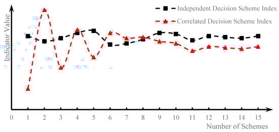 Generally, multiple construction simulation calculations can be regarded as multiple independent repeated experiments [22,23]. The simulation calculation of the previous scheme will not affect the result of the next scheme, and each indicator is independent and has the same distribution. However, when formulating construction schemes manually, decision-makers continuously learn and adjust appropriate construction parameters. This causes the indicator values to fluctuate significantly initially and then concentrate near a certain value, exhibiting an obvious local concentration trend. In other words, there is a certain correlation between various schemes, as shown in Figure 2. This paper mainly conducts multi-attribute decision-making and selection from the perspective of high-arch dam construction simulation calculation, so the following discusses the interval division of moderate indicators in line with the characteristics of uniform distribution.