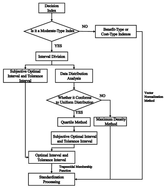 Due to the clear quantification directions of cost-type indicators and benefit-type indicators, which are universally recognized in calculation, the Range Method [26] or vector normalization method [27] can generally be adopted for their processing. Geometrically, vector normalization treats each data point as a vector and then normalizes its magnitude to 1. It can effectively reflect the relative distance between a scheme and the ideal solution in multi-attribute decision-making. However, its meaning is less intuitive than that of the extreme value method, and it is mostly used in specific multi-objective decision-making models such as TOPSIS. This paper adopts the latter to standardize the maximum-type and minimum-type indicators. For more vague moderate indicators, quantification can be carried out through the membership degree of the indicator value to the interval range, that is, the relative membership degree [28].