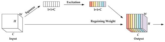 (1) SE: The Squeeze and Excitation (SE) module is a channel attention mechanism. It consists of two main parts: the Squeeze operation and the Excitation operation. This design allows the network to dynamically adjust the importance of different feature channels. At the same time, it suppresses features that are less useful for the task. The structure of the SE module is shown in Figure 2. SE recalibrates only the channels, yet workers within the workshop occlude one another, necessitating explicit spatial emphasis on critical regions. Consequently, CBAM is introduced to concurrently model both channels and spatial relationships.