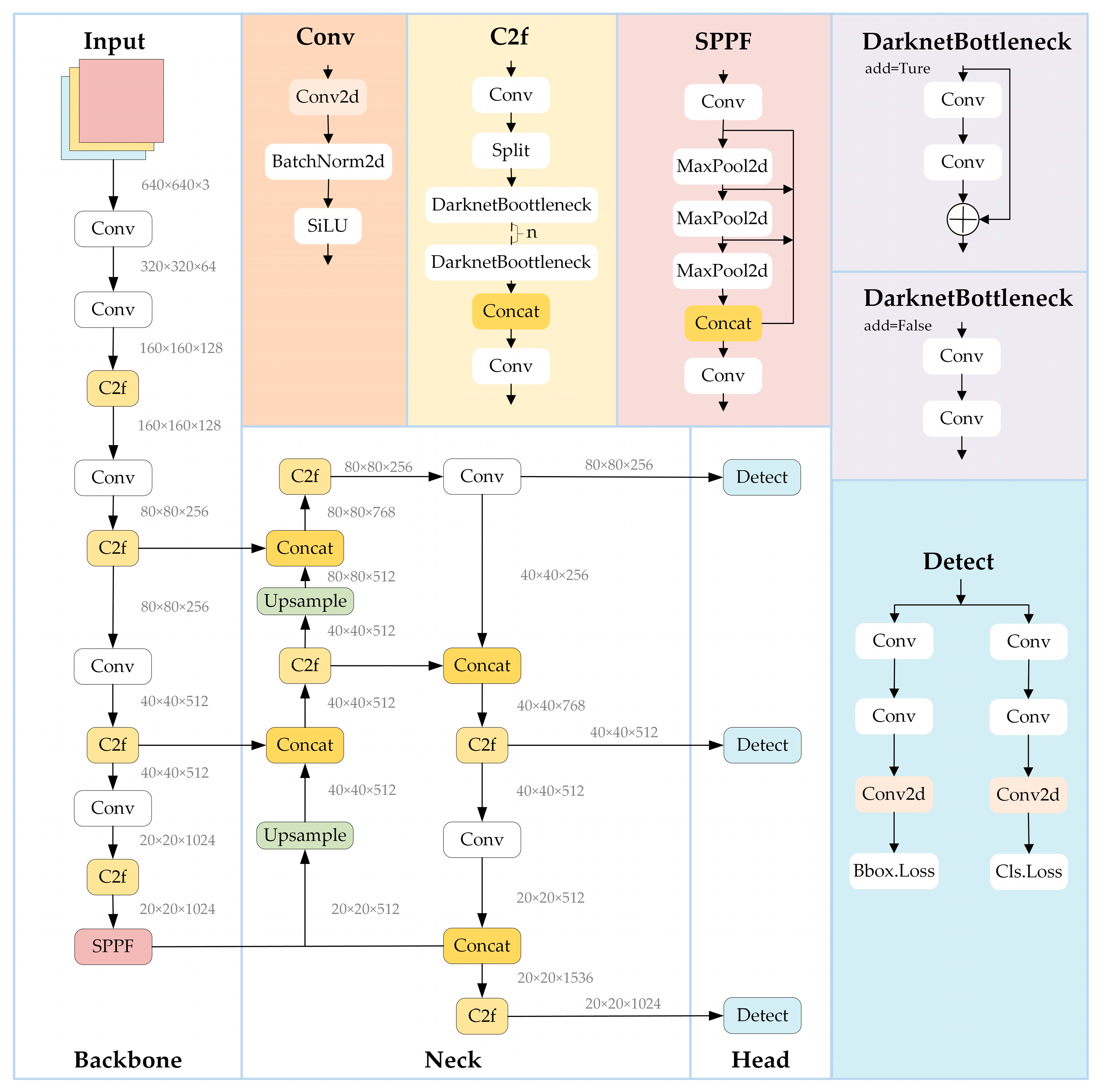 Figure 1 illustrates the YOLOv8 model. Its structure has three main parts: the Backbone, the Neck, and the Detection Head. The Backbone uses multiple layers with batch normalization and SiLU activation. This helps gradient flow better than the older ReLU function. A key improvement in YOLOv8 is the C2f module, which replaces the C3 module from YOLOv5. The C2f has more branches and skip connections. This gives richer feature details and better gradient flow, without needing much more computing power. It works especially well for spotting small objects. At the end of the Backbone, the SPPF module processes feature maps from different scales. It combines multi-level spatial information, which helps the model detect objects of various sizes. The Neck uses a PAN-FPN design. It mixes features from different Backbone layers. It samples features both top-down and bottom-up. Finally, it provides the Head with three separate feature maps made for objects of different sizes. The Head works without anchor boxes. It splits the job into two separate tasks: classifying objects and drawing bounding boxes. This separation reduces interference between the tasks and helps the model detect more accurately [