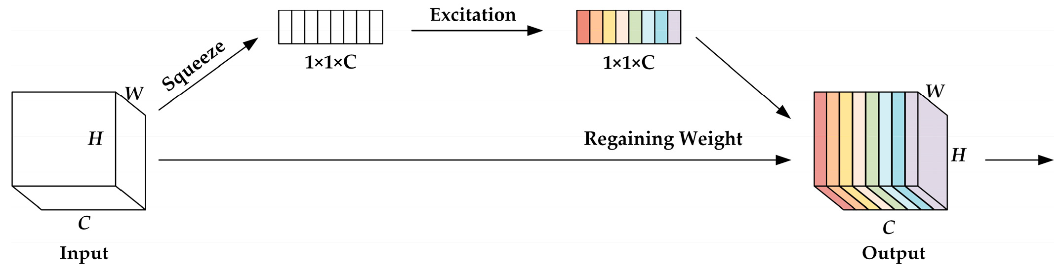 (1) SE: The Squeeze and Excitation (SE) module is a channel attention mechanism. It consists of two main parts: the Squeeze operation and the Excitation operation. This design allows the network to dynamically adjust the importance of different feature channels. At the same time, it suppresses features that are less useful for the task. The structure of the SE module is shown in