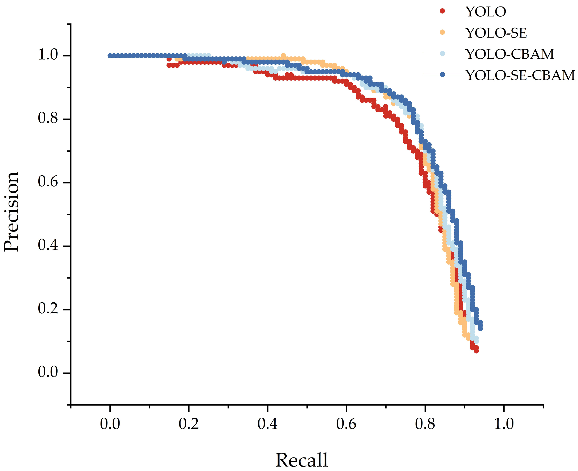 Figure 6, the original YOLOv8 model exhibits a precision approaching 1.0 at low recall grades, indicating high accuracy for predictions with strong confidence. However, with the increase in recall, precision rapidly decreases to about 0.1 in the high recall region (recall > 0.8). Namely, when more objects are detected, there are more false positives. For YOLOv8-SE, compared with YOLOv8, its precision is better than YOLOv8 in the medium-to-high recall range (recall > 0.6). For example, when recall = 0.8, its precision is much higher than YOLO’s.