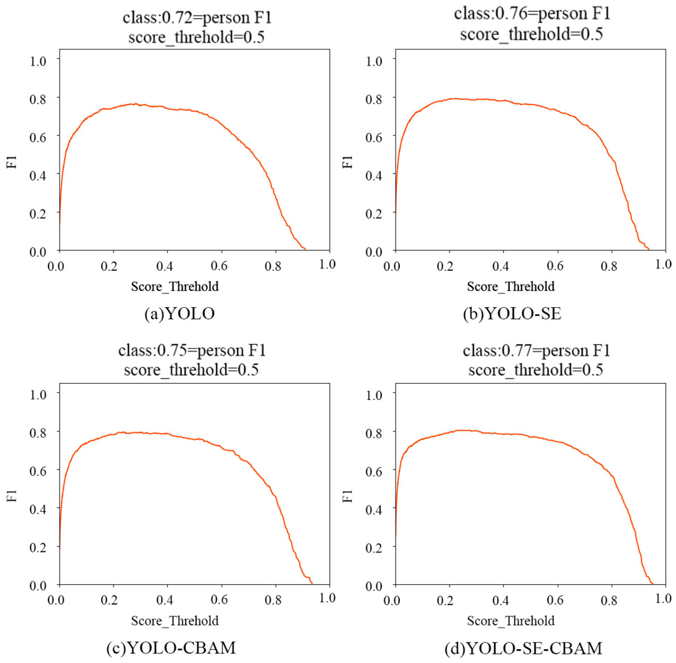 YOLOv8-SE-CBAM obtains the best performance in all models. When the recall is low, its accuracy is close to 1.0; when the recall = 0.6, its accuracy is close to 0.9; when the recall is high, its accuracy is much higher than the other three models. The highest F1-score achieved by the YOLOv8-SE-CBAM model, which integrates both SE and CBAM attention mechanisms, signifies its superior capability in balancing detection precision and recall under challenging industrial environments. YOLOv8-SE-CBAM outperforms all other models. The combined SE and CBAM attention mechanisms enhance its feature selection, allowing it to handle occlusions and complex postures effectively. SE attention mechanism and CBAM attention mechanism enhance the feature selection and focusing ability of the model, and YOLOv8-SE-CBAM is most effective at balancing recall and accuracy.