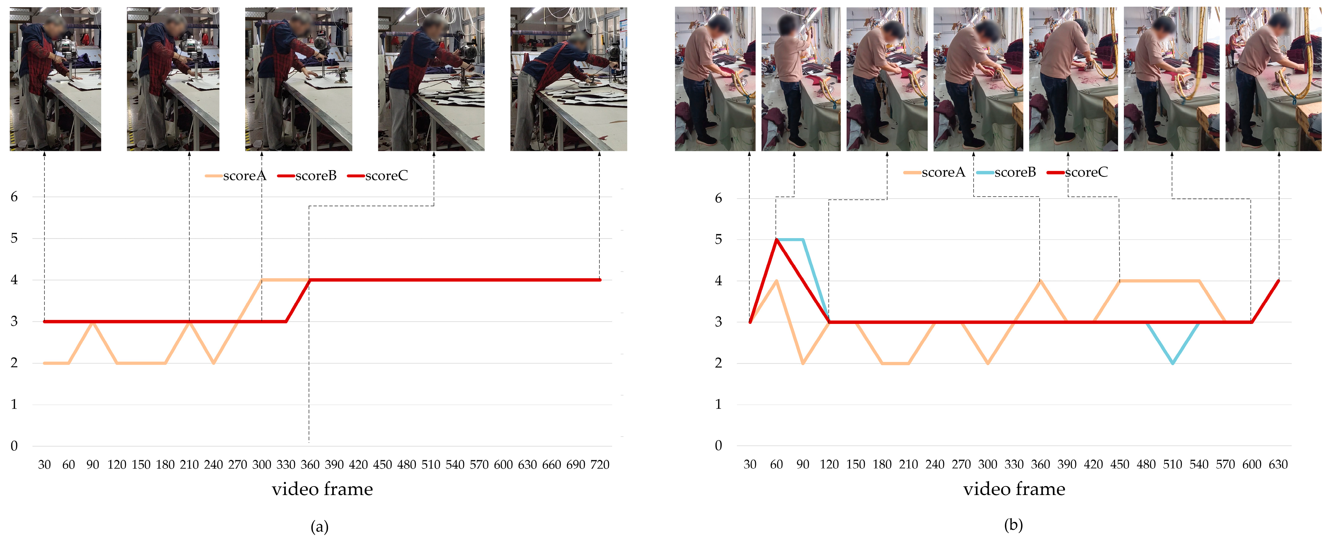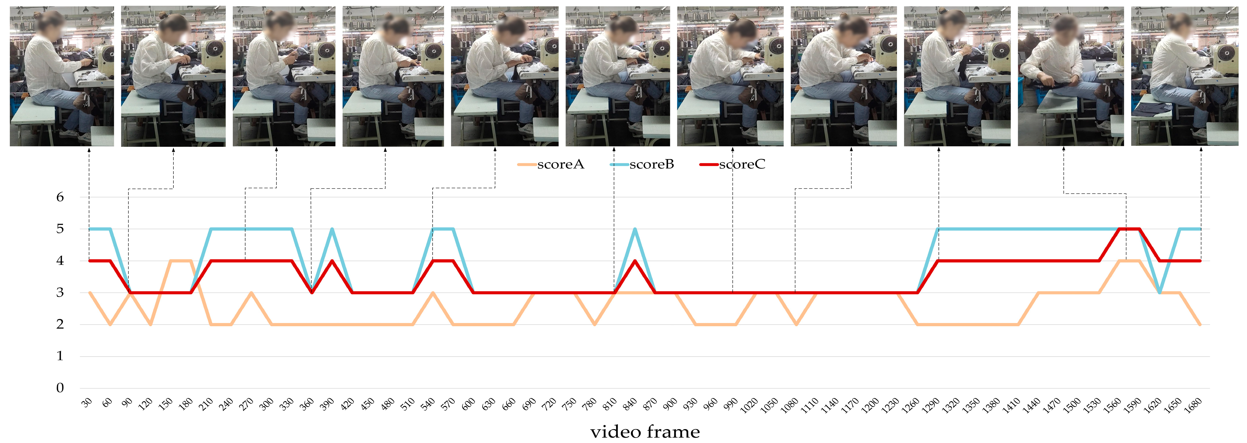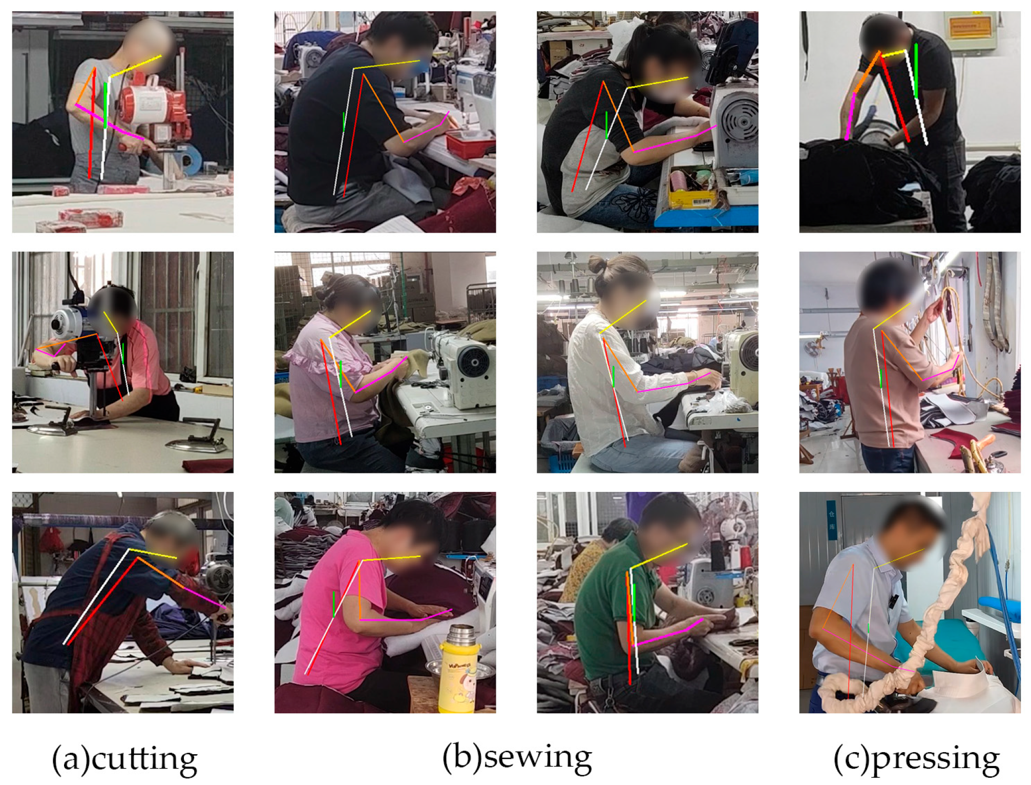 This study conducted ergonomic risk assessments on three primary processes in the sewing manufacturing industry: fabric cutting, sewing, and pressing. Video capture involved 3 master craftsmen for fabric cutting, 7 for sewing, and 4 for pressing. Based on posture estimation, all research participants were able-bodied. Ethical protocols were strictly followed throughout this study: All participants were required to sign informed consent forms, where they were fully informed of this study’s purpose, data usage, and the measures implemented to ensure data confidentiality and personal privacy. Additionally, three ergonomics experts were recruited; their manual assessment results will serve as a benchmark to verify whether the proposed method can achieve performance comparable to or exceeding that of human evaluators.
